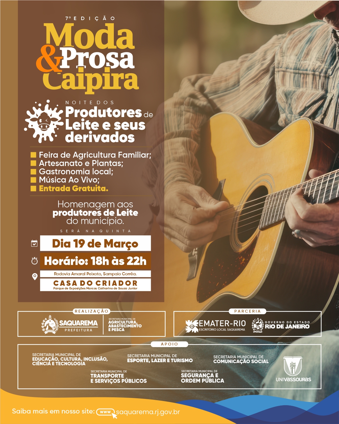 A Prefeitura de Saquarema, por meio da Secretaria Municipal de Agricultura, Abastecimento e Pesca, convida moradores e visitantes para prestigiar a Moda e Prosa Caipira – Noite dos Produtores de Leite e seus Derivados, que acontecerá no dia 19 de março, no Parque de Exposições Marcos Catharino, na Casa do Criador, em Sampaio Corrêa, a partir das 18 horas.