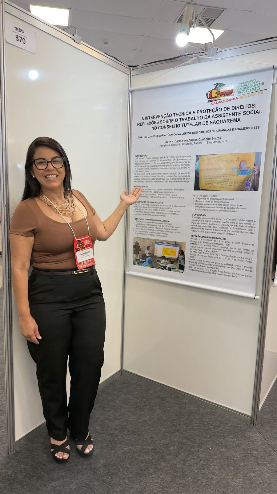 A Assistente Social Camila Coutinho, profissional atuante no Conselho Tutelar de Saquarema, teve seu artigo aprovado e apresentado no Congresso Brasileiro de Assistentes Sociais (CBAS), o maior e mais representativo evento da categoria no país. O congresso foi realizado entre os dias 3 e 7 de dezembro, no Centro de Convenções de Salvador, na Bahia, e reuniu mais de 4 mil participantes entre profissionais, docentes, pesquisadores e estudantes de diversas regiões.