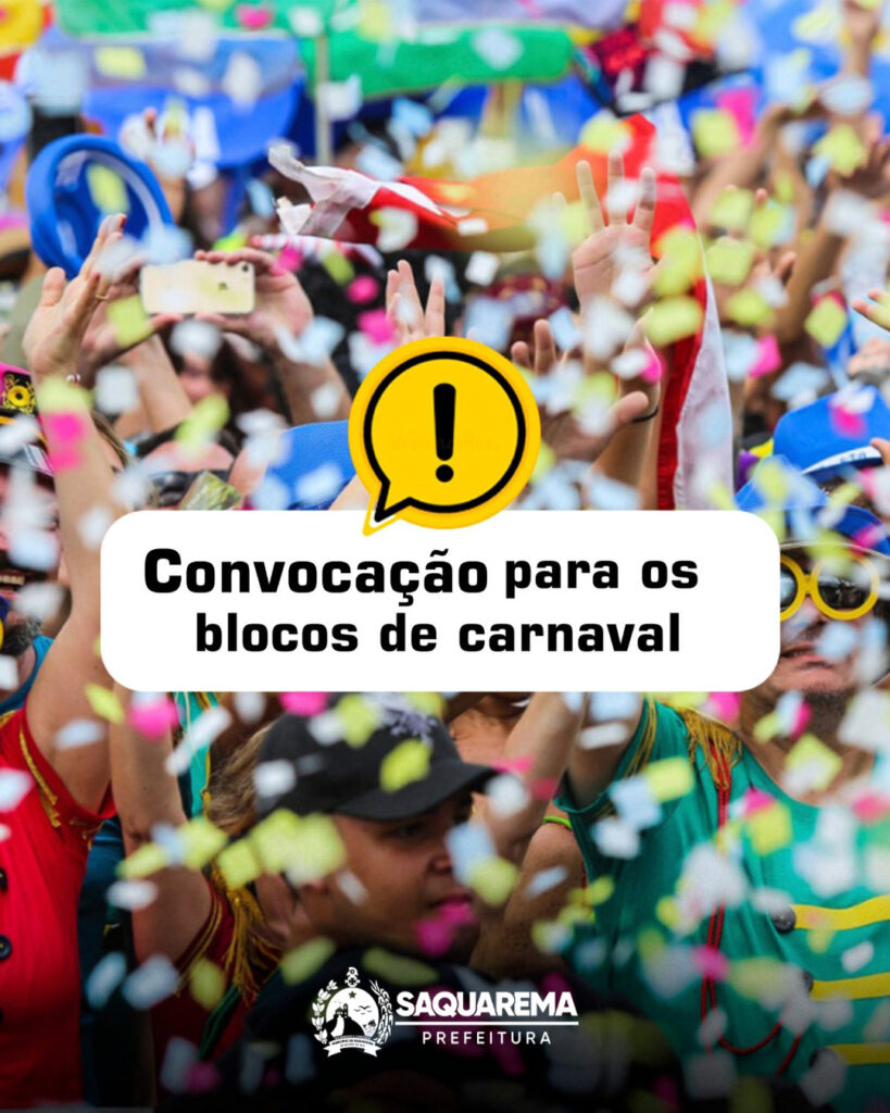 A Prefeitura de Saquarema, por meio da Secretaria Municipal de Esporte, Lazer e Turismo, CONVOCA os responsáveis por Blocos Carnavalescos da cidade de Saquarema para comparecerem à reunião que será realizada na próxima segunda-feira, 02/02, às 16 horas, no Teatro Municipal Mário Lago, na Rua Coronel Madureira, 77, no Centro de Saquarema.