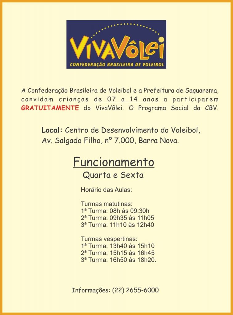 A Confederação Brasileira de Voleibol, em parceria com a Prefeitura de Saquarema, realizará o programa VivaVôlei. Voltado a atender crianças de 07 a 14 anos da rede municipal de educação, o programa oferecerá aulas gratuitas de vôlei no Centro de Desenvolvimento do Voleibol (Avenida Salgado Filho, 7000, Barra Nova).