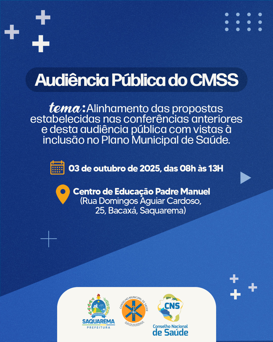 O Conselho Municipal de Saúde, com apoio da Prefeitura de Saquarema, convoca os conselheiros de saúde, representantes de entidades, movimentos sociais e demais interessados a participarem de uma audiência pública que será realizada no dia 03/10 (sexta-feira), das 08 às 13 horas, no auditório do Centro Municipal de Educação Padre Manuel. A entrada é gratuita.