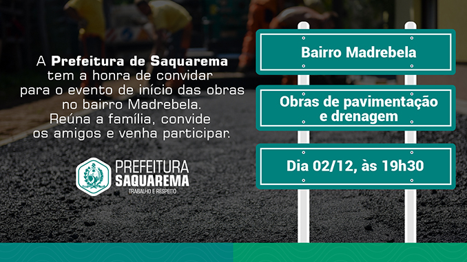 A Prefeitura de Saquarema tem uma excelente notícia para os moradores de Madrebela! A Prefeitura, por meio da Secretaria de Obras e Urbanismo, dará início às obras de drenagem, pavimentação e urbanização das ruas do bairro, trazendo mais qualidade de vida para a população.