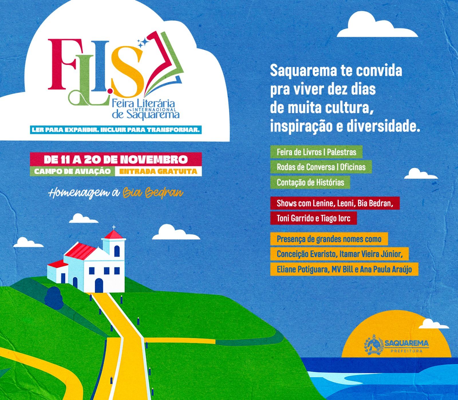 No período em que ocorre a COP30, a Feira Literária Internacional de Saquarema (FLIS) investe na literatura voltada para a educação sustentável e o respeito às diversidades. A lista de convidados da quarta edição da feira, que ocorre entre os dias 11 e 20 de novembro no Campo de Aviação, inclui nomes como Itamar Vieira Junior, o angolano José Eduardo Agualusa, Conceição Evaristo, MV Bill, Eliana Alves Cruz e Eliane Potiguara, moradora da cidade e considerada a primeira escritora indígena a publicar um livro no Brasil.