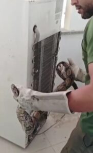 A Guarda Ambiental de Saquarema foi acionada no início da noite desta quarta-feira, 04 de fevereiro, para atender a uma ocorrência em uma residência localizada no bairro de Jaconé. Ao chegar ao local, a equipe encontrou uma jiboia escondida no compartimento do motor de uma geladeira, situação que exigiu atenção, técnica e cuidado durante o resgate.