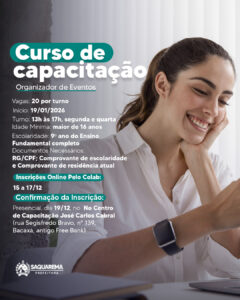 A Prefeitura de Saquarema está com inscrições abertas para o Curso de Capacitação em Organizador de Eventos, uma oportunidade voltada à qualificação profissional e à ampliação das chances de inserção no mercado de trabalho. O curso oferece 20 vagas por turno e tem início previsto para o dia 19 de janeiro de 2026, com aulas das 13h às 17h, às segundas e quartas-feiras.