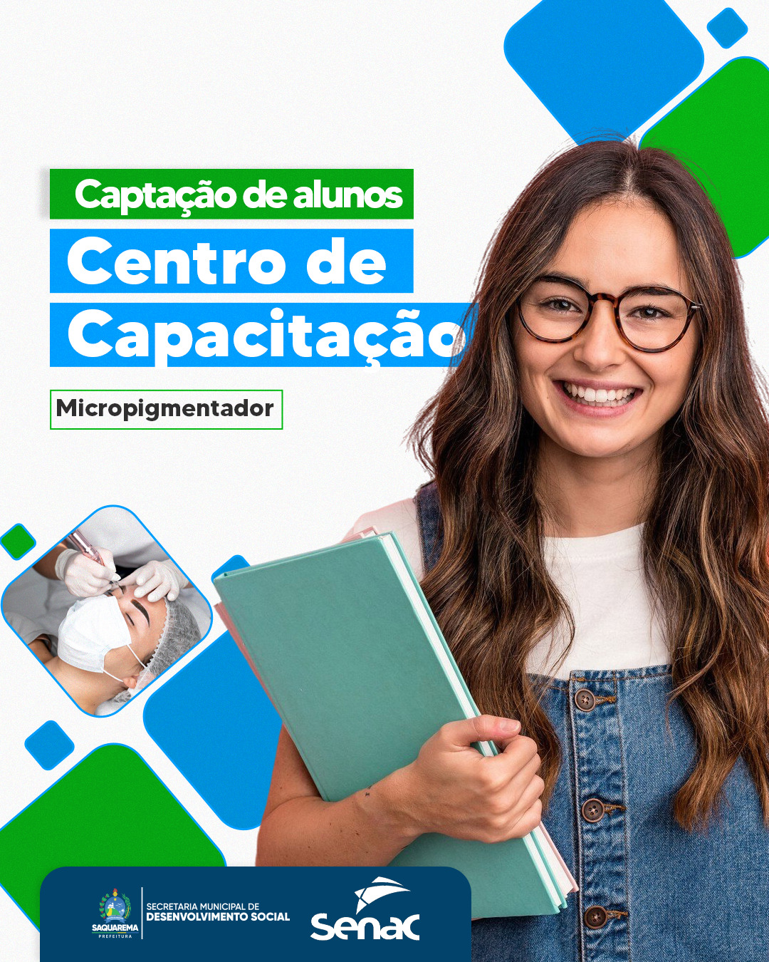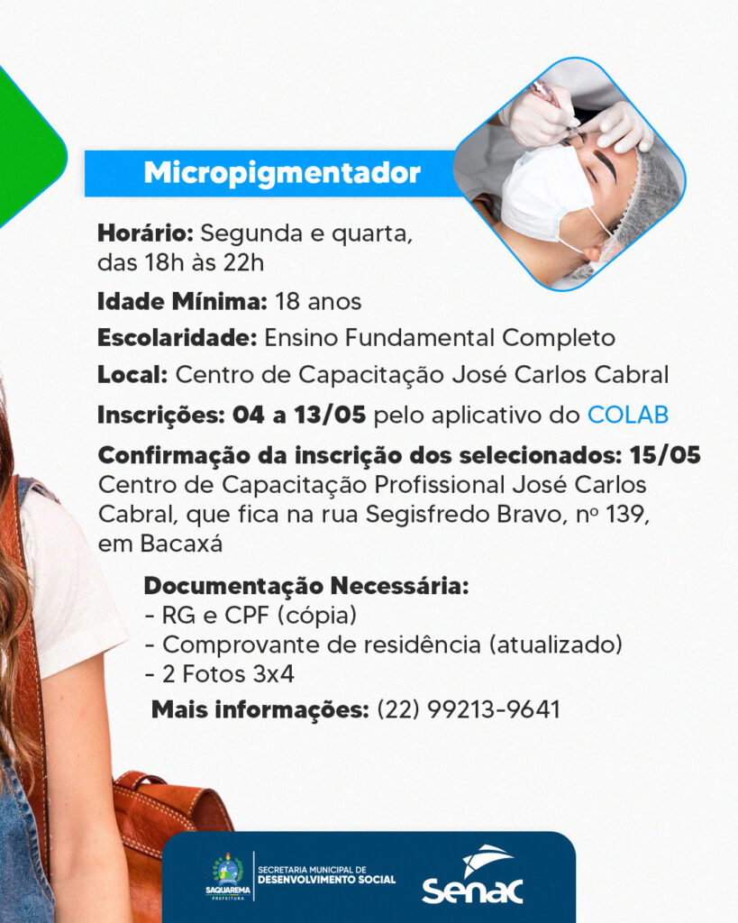 A Prefeitura de Saquarema, por meio da Secretaria Municipal de Desenvolvimento Social, em parceria com o Senac, está com inscrições abertas para o curso de Micropigmentador, oferecido no Centro de Capacitação Profissional José Carlos Cabral.