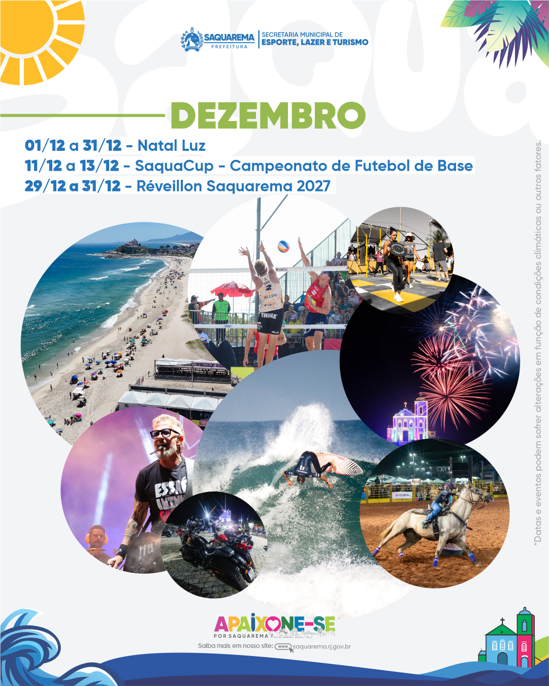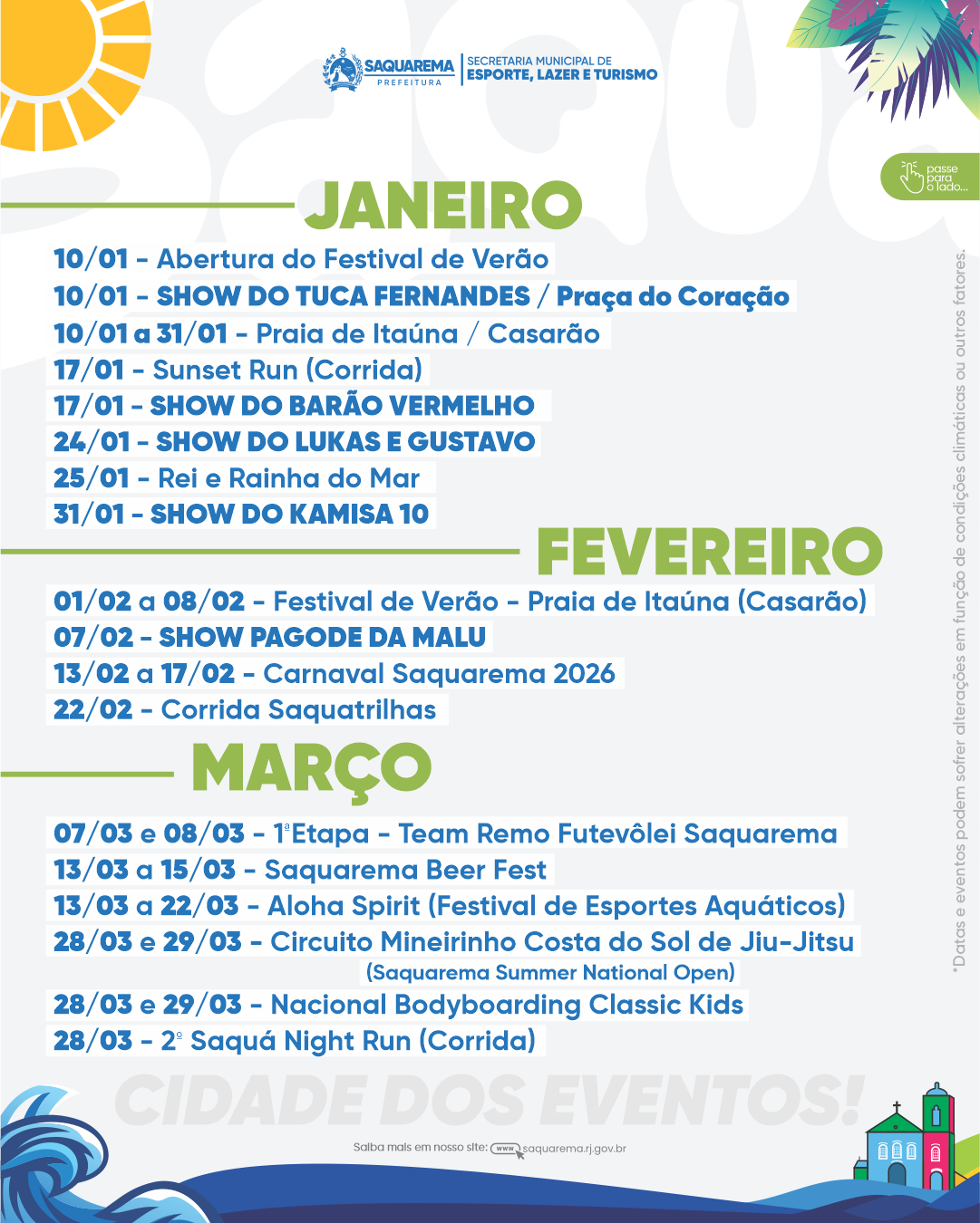 A Prefeitura de Saquarema, por meio da Secretaria Municipal de Esporte, Lazer e Turismo, apresentou o Calendário Oficial de Eventos para 2026. O documento é uma ferramenta estratégica que beneficia o planejamento de moradores, turistas e profissionais do setor turístico e hoteleiro, além de contribuir para a organização de ações e investimentos na cidade ao longo do ano.