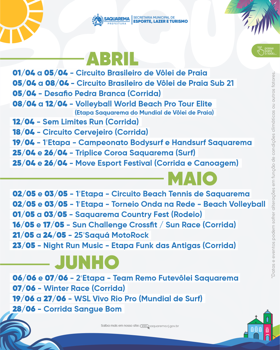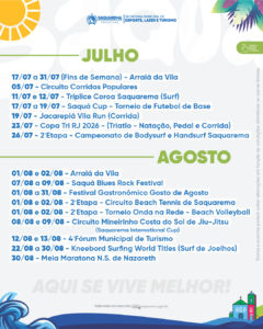 De acordo com a Secretaria Municipal de Esporte, Lazer e Turismo, o calendário foi planejado para atender de forma eficiente as demandas do setor turístico e hoteleiro. Além disso, a programação organizada é essencial para profissionalizar o trade turístico e consolidar Saquarema como um dos principais destinos do Brasil no cenário nacional e internacional. A Secretaria ressalta que a programação poderá sofrer alterações ao longo do ano, conforme as demandas apresentadas. O calendário completo de eventos de 2026 já está disponível para consulta.