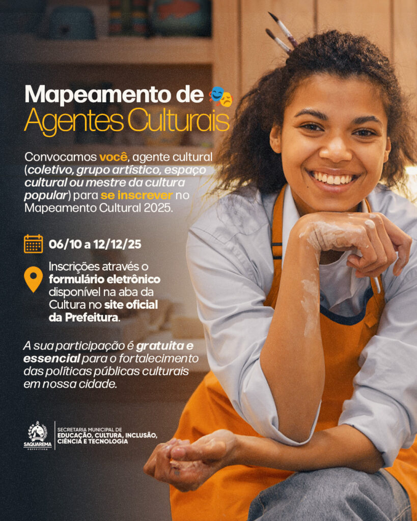 A Prefeitura de Saquarema, por meio da Secretaria Municipal de Educação, Cultura, Inclusão, Ciência e Tecnologia, convoca você, agente cultural (coletivo, grupo artístico, espaço cultural ou mestre da cultura popular) para se inscrever no Mapeamento Cultural 2025. O período de inscrição será de 06 de outubro a 12 de dezembro. As inscrições são gratuitas e deverão ser feitas através de formulário eletrônico disponível na aba da Cultura no site oficial da Prefeitura (clique aqui).