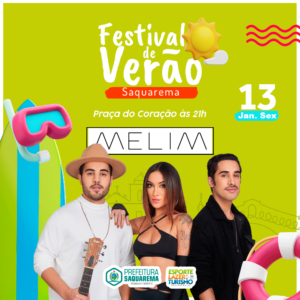 O show de abertura do Festival neste ano será com o trio Melim, em uma grande apresentação no dia 13 de janeiro, a partir das 21 horas, na Praça do Coração, no Centro. Nascidos em Niterói, os irmãos Rodrigo, Diogo e Gabi são donos de diversas músicas de sucesso no Brasil, como “Meu Abrigo”, “Ouvi Dizer”, “Gelo” e “Eu Feat. Você’. Se aventurando na música desde cedo, uniram-se para cantar em um festival, e, desde então, nunca mais se separaram.