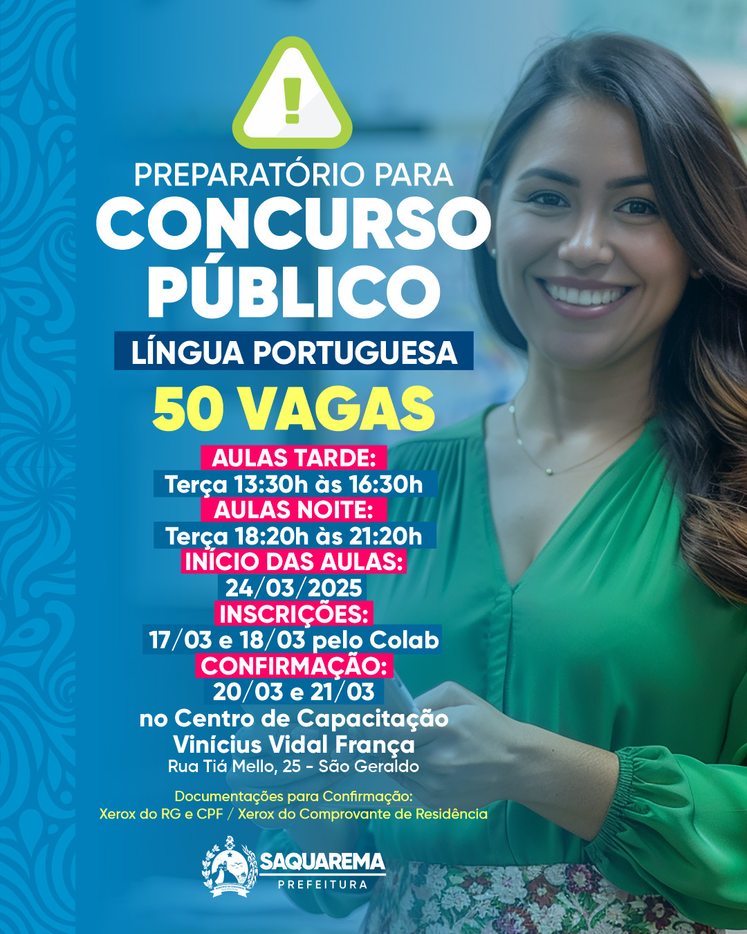 A Prefeitura de Saquarema, por meio do Centro de Capacitação Vinícius Vidal França, abriu inscrições para cursos preparatórios gratuitos voltados a candidatos interessados em concursos públicos e no ingresso no Colégio Naval. Ao todo, estão sendo oferecidas 150 vagas, distribuídas entre os cursos de Língua Portuguesa, Disciplinas Pedagógicas e Colégio Naval.