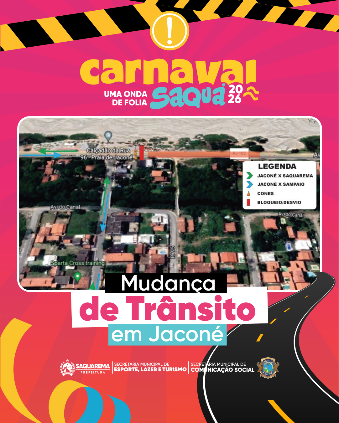 Em Jaconé, as alterações ocorrerão na RJ-102, Avenida Beira-Mar. O trecho a ser interditado fica próximo ao calçadão da Rua 96, local onde será montado o palco para os festejos de carnaval. Os motoristas deverão utilizar a Rua 96 como rota alternativa para contornar a área interditada.