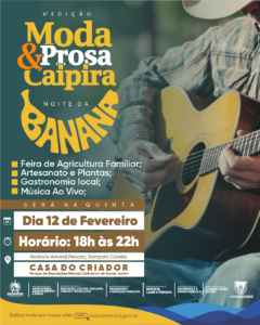 A Prefeitura de Saquarema, por meio da Secretaria Municipal de Agricultura, Abastecimento e Pesca, realizará no dia 12 de fevereiro a 6ª edição do “Moda e Prosa Caipira – Noite da Banana”. O evento acontece a partir das 18h, no Parque de Exposições Marcos Catharino, na Casa do Criador, em Sampaio Corrêa, e tem como proposta valorizar a cultura rural e fortalecer a agricultura familiar do município.