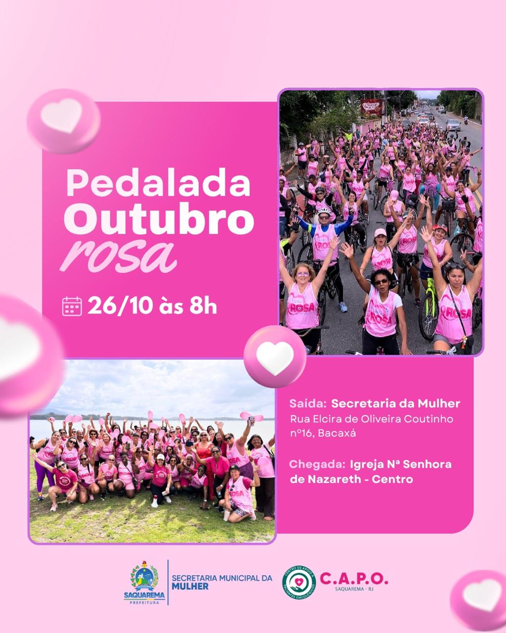 A Prefeitura de Saquarema, por meio da Secretaria Municipal da Mulher, promoverá neste domingo, 26 de outubro, a tradicional Pedalada Outubro Rosa, evento que une esporte, conscientização e mobilização social em prol da saúde da mulher. A concentração será às 8h, na sede da Secretaria da Mulher, localizada na Rua Elcira de Oliveira Coutinho, nº 16, em Bacaxá, com chegada na Igreja Nossa Senhora de Nazareth, no Centro.