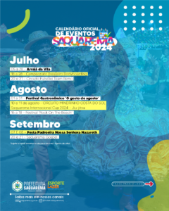 A programação do calendário turístico de Saquarema poderá sofrer modificações ao longo do ano, de acordo com a demanda apresentada à Secretaria Municipal de Esporte, Lazer e Turismo. Confira, abaixo, a íntegra do calendário turístico de Saquarema: