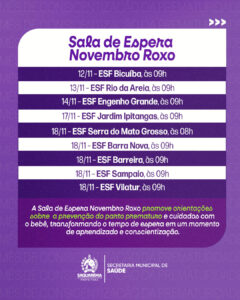 Como parte das ações, estão sendo promovidas as atividades da Sala de Espera Novembro Roxo nas unidades da Estratégia de Saúde da Família (ESF) de todo o município. Os encontros acontecem em diferentes datas e locais, sempre às 9h, e têm como objetivo orientar gestantes e familiares sobre a prevenção do parto prematuro, além de oferecer informações e acolhimento sobre os cuidados essenciais com os recém-nascidos.