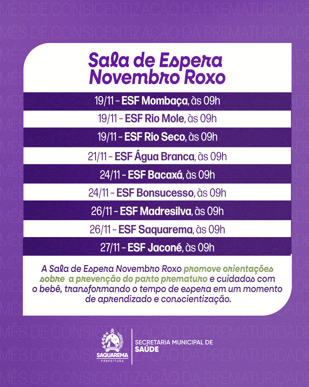 A Prefeitura de Saquarema, por meio da Secretaria Municipal de Saúde, realiza durante todo o mês a campanha Novembro Roxo, dedicada à conscientização sobre a prematuridade e aos cuidados com o bebê prematuro.
