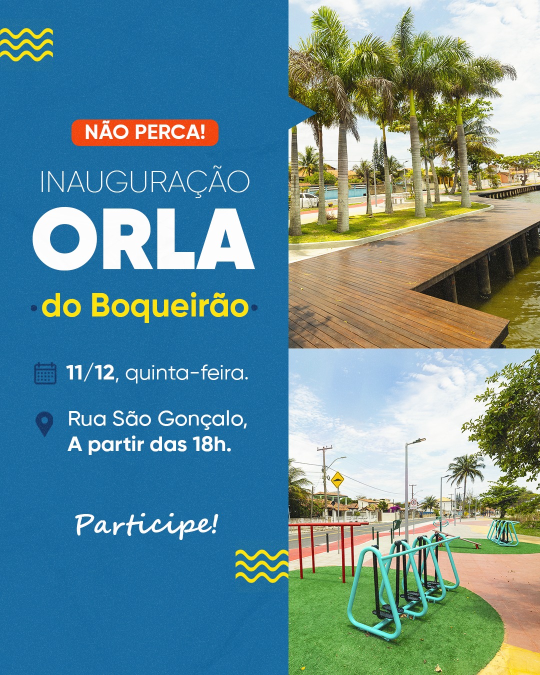 A Prefeitura de Saquarema, por meio da Secretaria Municipal de Infraestrutura, tem um convite especial para a população, em especial aos moradores do Boqueirão! Na próxima quinta-feira, dia 11, a partir das 18 horas, a Prefeitura fará a inauguração da nova Orla do Boqueirão! A cerimônia é aberta ao público que poderá conferir o novo ponto turístico da cidade!
