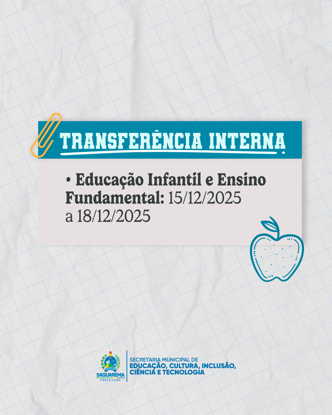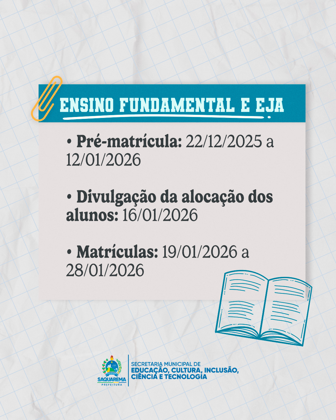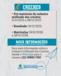 A efetivação da matrícula seguirá o cronograma disponibilizado na Portaria nº 06/2025, da Secretaria Municipal de Educação, Cultura, Inclusão, Ciência e Tecnologia. Para conferir a íntegra do documento, clique aqui.