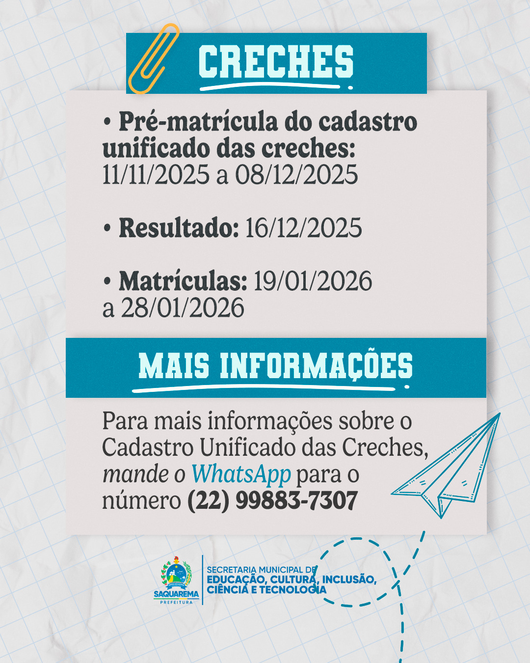 A Prefeitura de Saquarema, por meio da Secretaria Municipal de Educação, Cultura, Inclusão, Ciência e Tecnologia, vai iniciar o período de pré-matrícula para as escolas da Rede Municipal de Ensino.
