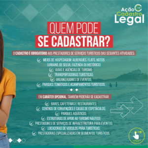 O Cadastro Legal contará com agendamento da equipe técnica da Secretaria de Esporte, Lazer e Turismo, juntamente com os profissionais da Sala do Empreendedor, que visitarão os estabelecimentos hoteleiros da cidade no dia e horário marcados. Durante o encontro, os agentes públicos efetuarão o cadastramento dos prestadores de serviços turísticos, junto ao CADASTUR, conforme orienta a Lei Geral do Turismo (Lei 11.711/2008). Além disso, aos estabelecimentos que apresentarem pendências cadastrais, será ofertado auxílio técnico para a regularização junto aos órgãos competentes.