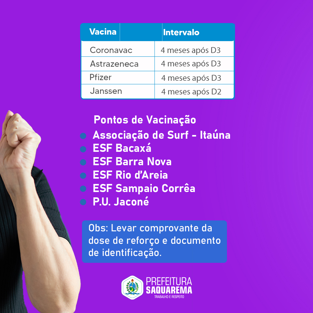 A Prefeitura de Saquarema, por meio da Secretaria de Municipal de Saúde e seguindo a determinação do Plano Nacional de Imunização, inicia a aplicação da segunda dose de reforço da vacina contra a Covid-19. Idosos acima de 70 anos que receberam a terceira dose da AstraZeneca, Pfizer ou Coronavac, bem como a dose de reforço (D2) da Janssen há mais de quatro meses, poderão receber nova dose dos imunizantes. De acordo com o Ministério da Saúde, com exceção da Coronavac, todas as demais vacinas podem ser usadas como dose de reforço.