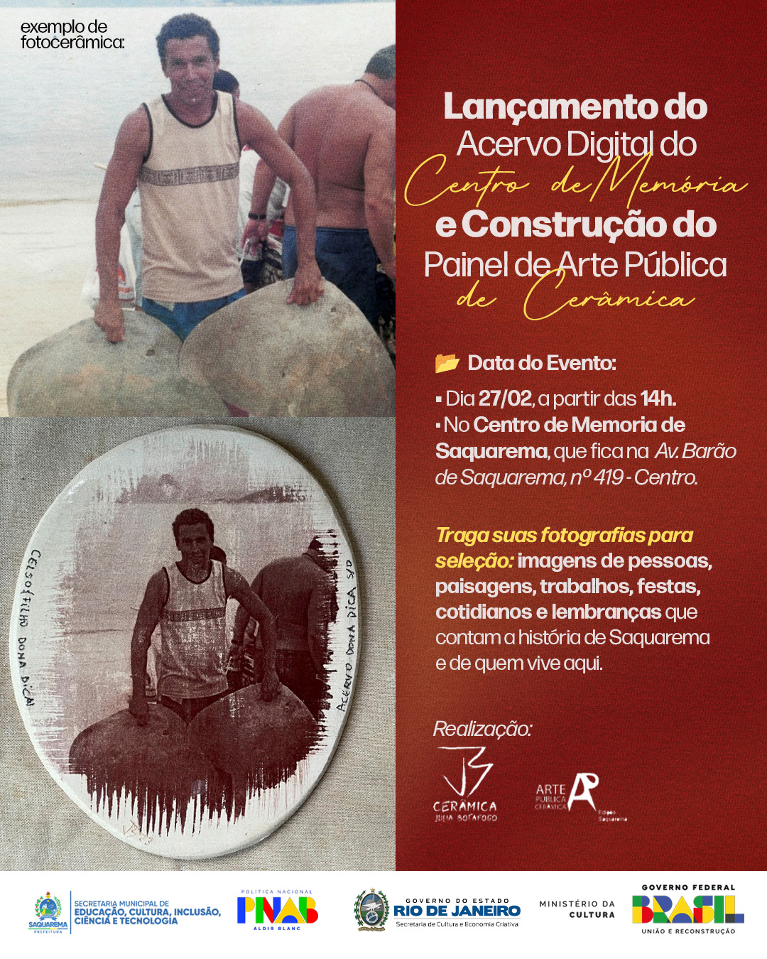 A Prefeitura de Saquarema, por meio da Secretaria de Educção, Cultura, Inclusão, Ciência e Tecnologia convida a população para o lançamento do Acervo Digital do Centro de Memória e para o início da construção do Painel de Arte Pública de Cerâmica, iniciativas que valorizam a história, a identidade e a cultura do município.