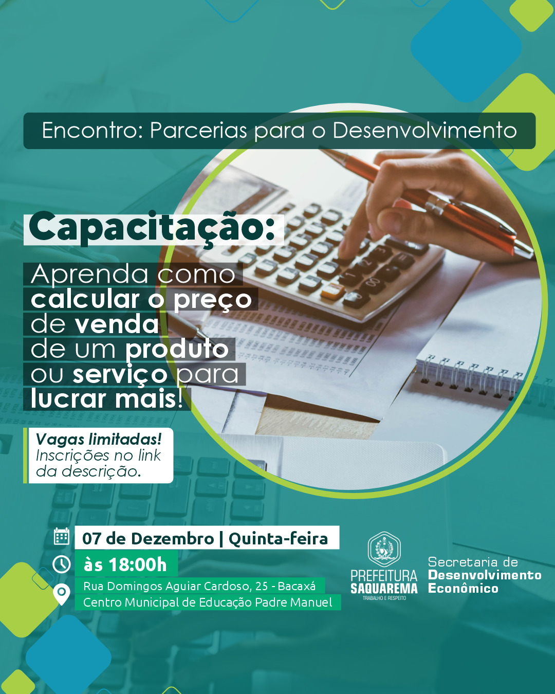A capacitação será realizada no dia 07/12, a partir das 18 horas, no auditório do Centro Municipal de Educação Padre Manuel, na Rua Domingos de Aguiar Cardoso, 25, Bacaxá. Durante o encontro, os participantes receberão dicas e instruções para aprender como calcular o preço de venda de um produto ou serviço para lucrar mais.