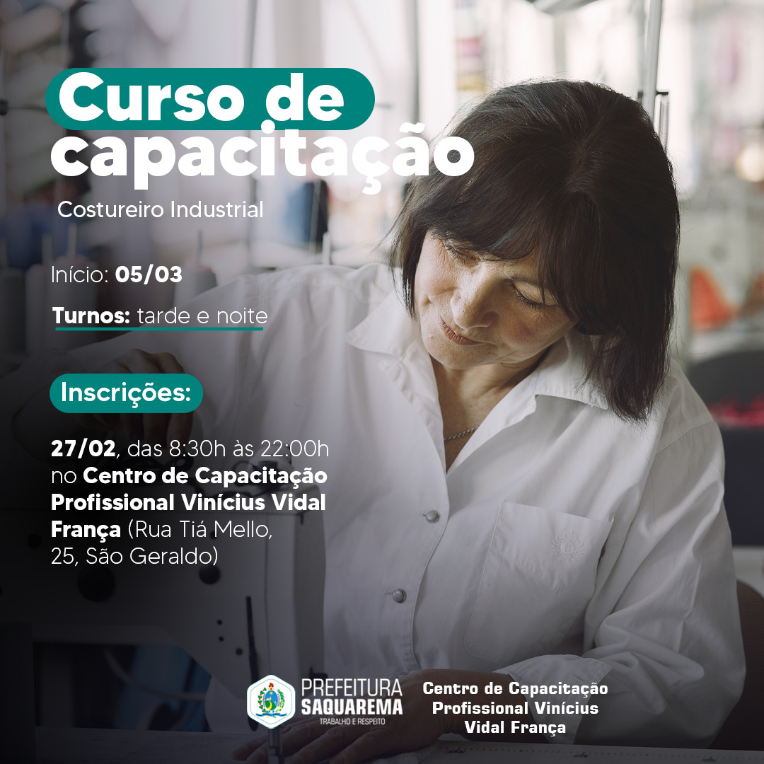 A Prefeitura de Saquarema está disponibilizando aos moradores mais um curso profissionalizante gratuito, desta vez o de Costureiro Industrial. As inscrições, por ordem de chegada, estarão abertas na terça-feira, dia 27 de fevereiro, das 8h30h às 20h, no Centro de capacitação Profissional Vinicius Vidal França