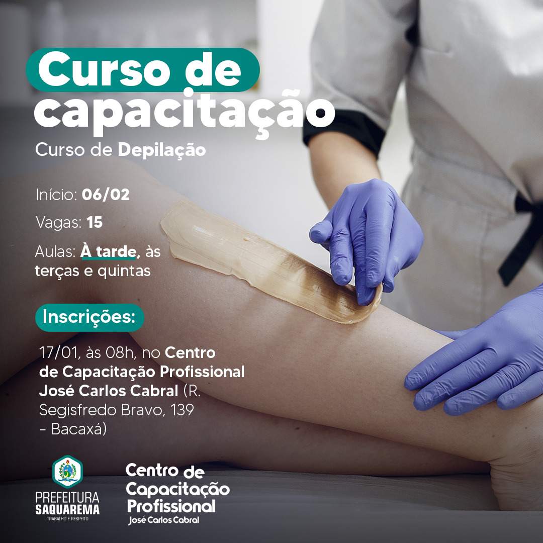 A Prefeitura de Saquarema está disponibilizando 15 vagas para o curso profissionalizante de depilação, destinado aos moradores da cidade. As inscrições, por ordem de chegada, poderão ser realizadas no dia 17 de janeiro, a partir das 08h, no Centro de Capacitação Profissional José Carlos Cabral, localizado na Rua Segisfredo Bravo, nº 139, em Bacaxá.
