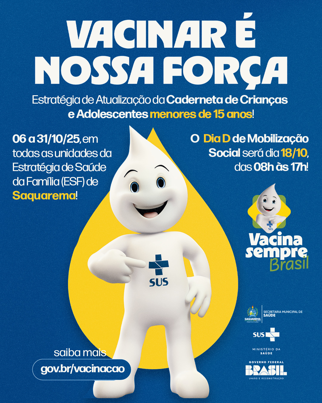 A Prefeitura de Saquarema reforça o convite para que todas as famílias compareçam às unidades de saúde durante a campanha. A vacinação é um ato de cuidado, proteção e amor que garante às nossas crianças e adolescentes um futuro mais saudável e seguro.