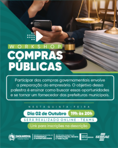 A Prefeitura de Saquarema, em parceria com o Sebrae e a Sala do Empreendedor, realizará no próximo dia 02 de outubro, das 19h às 20h, o Workshop de Compras Públicas, uma palestra online voltada aos empresários locais.