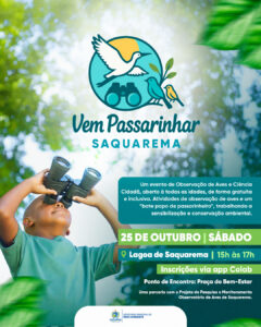 A Prefeitura de Saquarema, por meio da Secretaria Municipal de Meio Ambiente, promove no dia 25 de outubro, mais uma edição do projeto “Vem Passarinhar”.
