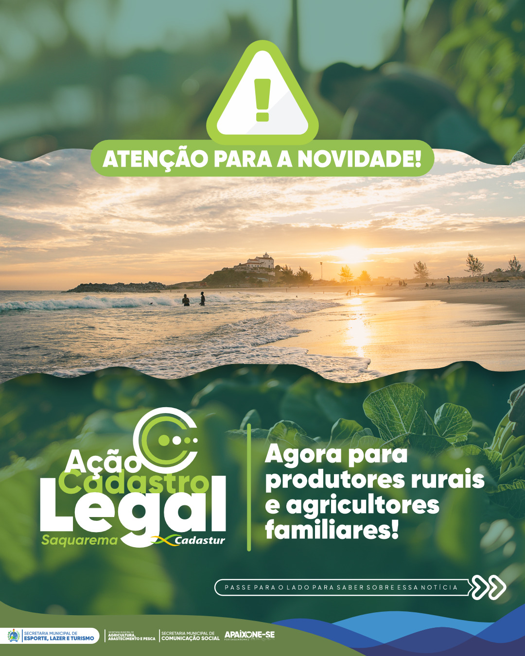 A Prefeitura de Saquarema, por meio da Secretaria Municipal de Esporte, Lazer e Turismo, anuncia uma importante novidade na Ação Cadastro Legal Saquarema – Cadastur: agora, além dos prestadores de serviços turísticos tradicionais, produtores rurais e agricultores familiares também passam a ser contemplados pelo sistema.