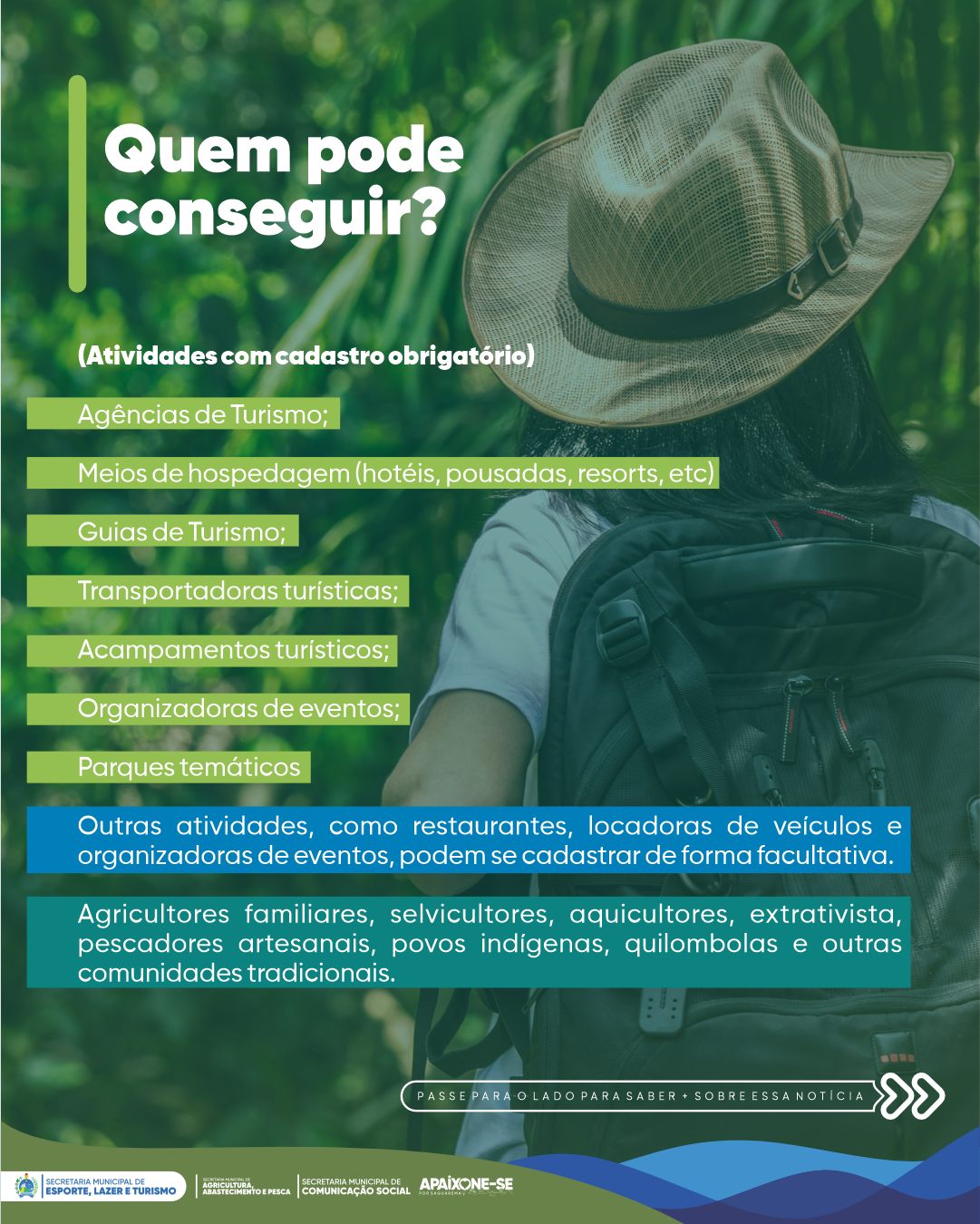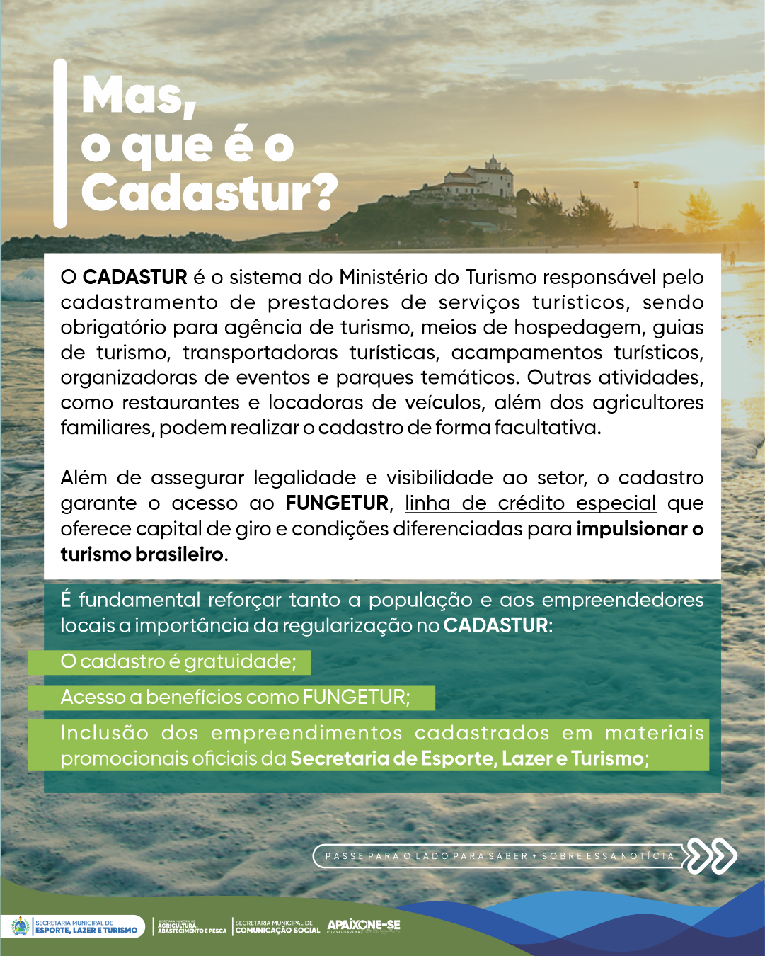 O Cadastur é a ferramenta oficial do Ministério do Turismo para o registro de prestadores de serviços turísticos em todo o Brasil. O cadastramento é obrigatório para atividades como agências de turismo, meios de hospedagem, guias de turismo, transportadoras turísticas, acampamentos, organizadoras de eventos e parques temáticos. Outras atividades, como restaurantes e locadoras de veículos, podem se cadastrar de forma facultativa. A novidade é a inclusão dos agricultores familiares, silvicultores, aquicultores, extrativistas, pescadores artesanais, povos indígenas, quilombolas e outras comunidades tradicionais, ampliando o alcance e a representatividade do programa.