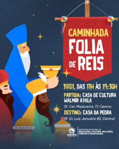 A Prefeitura de Saquarema, por meio da Secretaria Municipal de Educação, Cultura, Inclusão, Ciência e Tecnologia, convida toda a população para a Caminhada Folia de Reis. O evento é uma celebração dedicada a valorizar a cultura popular, a fé e as tradições que formam a identidade do nosso município.