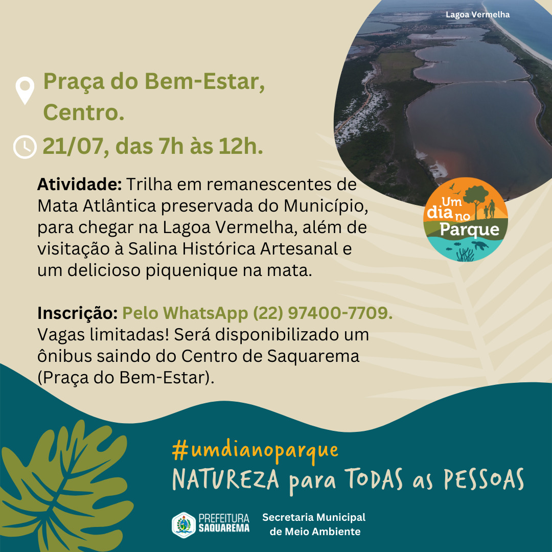 A Prefeitura de Saquarema, por meio da Secretaria Municipal de Meio Ambiente, participará da campanha nacional Um Dia No Parque! Esta é uma iniciativa da coalizão pró unidades de conservação da natureza.