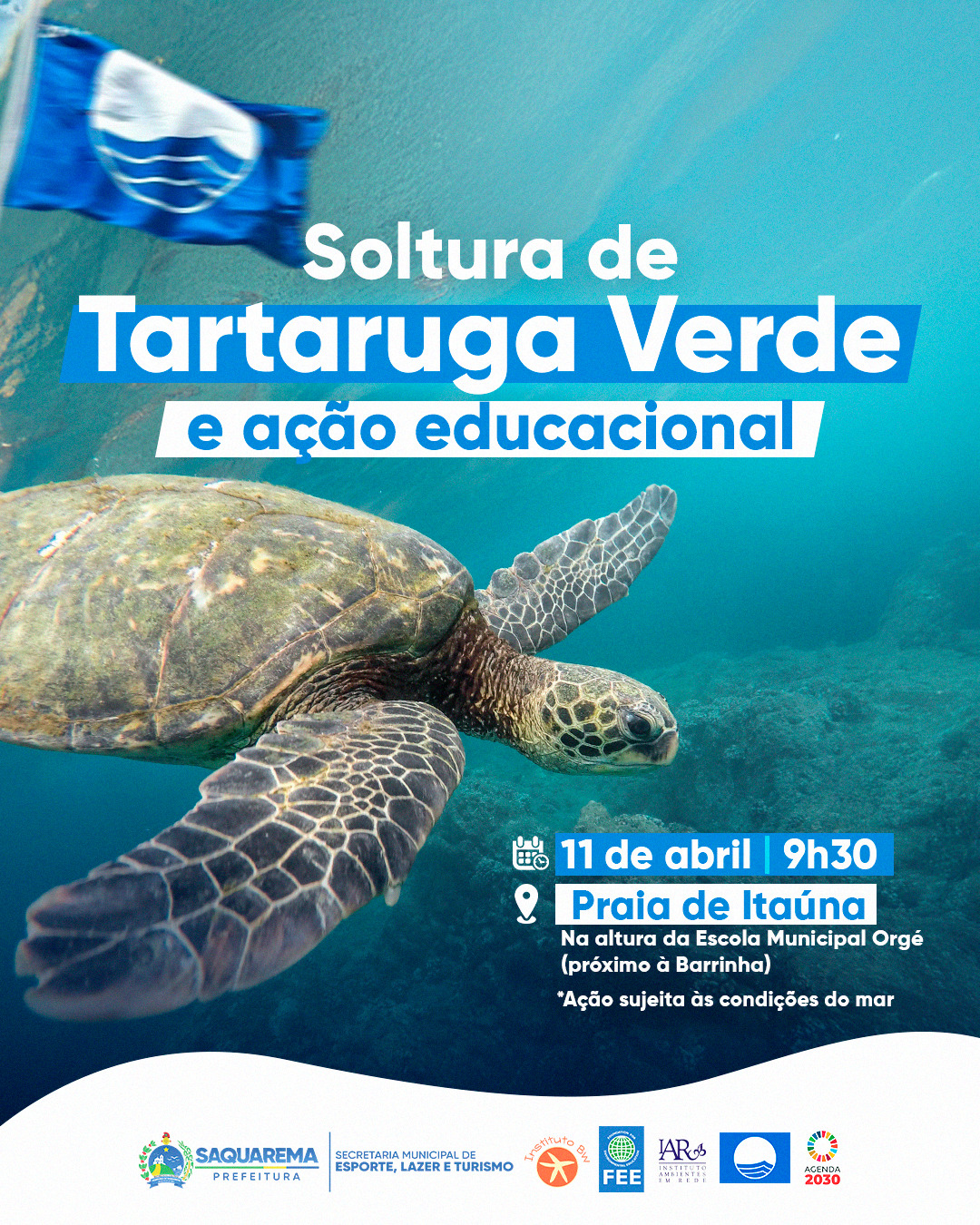 A Prefeitura de Saquarema, por meio da Secretaria Municipal de Esporte, Lazer e Turismo, realizará no próximo dia 11 de abril, às 9h30, uma ação especial de soltura de tartaruga-verde na Praia de Itaúna, na altura da Escola Municipal Orge, próximo à Barrinha. O evento contará também com uma atividade educativa voltada à conscientização ambiental.