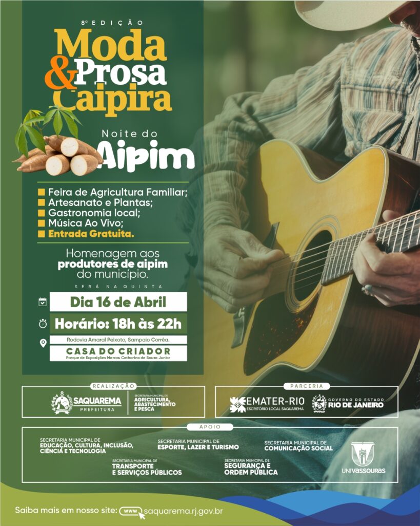 A Prefeitura de Saquarema realizará, no próximo dia 16 de abril, a 8ª edição do evento “Moda & Prosa Caipira – Noite do Aipim”, no Parque de Exposições Marcos Catharino de Souza Junior, na Casa do Criador, em Sampaio Corrêa. A programação acontece das 18h às 22h e terá entrada gratuita.