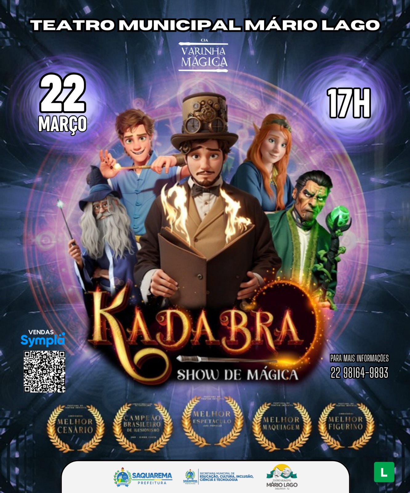 “Kadabra” é um espetáculo infanto-juvenil inspirado em um universo mágico, que combina teatro, música e arte mágica em uma experiência única. Ganhador do prêmio de Melhor Espetáculo Infantil, o show é dirigido por Diego Costa, campeão brasileiro de mágica, e já conquistou mais de 15 mil espectadores, tornando-se um sucesso de bilheteria.