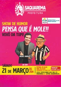 O Teatro Municipal Mário Lago receberá dois espetáculos no fim de semana, em Saquarema. No dia 21 de março, sábado, às 20h, será apresentada a comédia “Pensa que é Mole?”; e no domingo, dia 22, às 17h, será a vez do espetáculo infantil “Kadabra”.