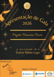 Com a participação de 60 alunos e direção de Patrícia Beltrão, a Apresentação de Gala 2026 do Projeto Primeiro Passo tem como tema “Essa é a nossa onda: uma aventura no fundo do mar”, com diversas coreografias e modalidades de dança. O espetáculo tem 2 horas de duração e os ingressos podem ser adquiridos por R$ 25,00 (meia-entrada ou antecipado) e R$ 50,00 (inteira ou na hora do evento).