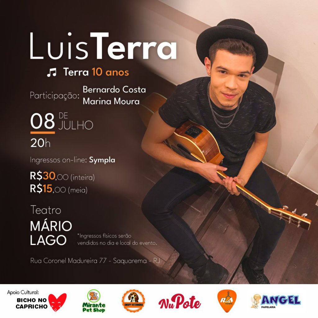O Teatro Municipal Mário Lago receberá, no sábado, dia 08 de julho, a partir das 20h, o show “Terra 10 anos”, comemorando os 10 anos de carreira do cantor e compositor Luis Terra. Repleto de canções autorais e de compositores que o influenciaram ao longo de sua trajetória musical, interpretando desde clássicos da MPB até compositores de sua geração, o show traz uma proposta intimista, onde o músico, acompanhado pelo violão, seu principal instrumento, divide histórias e recita poesias ao longo do roteiro ao lado de Bernardo Costa, seu companheiro de vida e pianista com quem tem composto suas mais recentes parcerias. O show também conta com programações eletrônicas, elaboradas ao longo do processo de feitura do roteiro, trazendo um toque experimental à apresentação que tem na abertura a cantora e compositora Marina Moura.